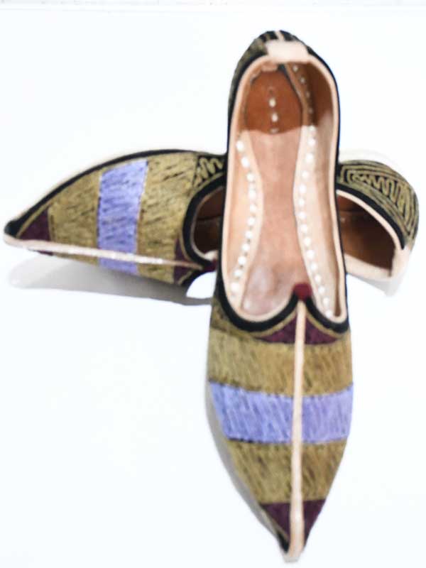 Handmade Embroidered Mojari or Juti (Rajasthani footwear) is recognized as the most classic footwear of the India. These highly colorful Mojaries will undoubtedly suit the fashion taste of every individual. Mojari is a generic name of handcrafted ethnic footwear produced in India. These are generally made of sheep, camel or goat leather and the designs are created on the velvet casing attached to the leather. These are soft and extremely comfortable to use. Jaisalmer, Jodhpur, Barmer, Bikaner, Pali and Jalore are world famous for their intricately and finely designed Jutis/Mojaries.Beautiful handcrafted embroidered stylish mojari from Bhinmal(Rajasthan). Styled for comfort, Juti is recognized as the most classic footwear for men. This multi colour Mojari with traditional embroidery work will undoubtedly suit the fashion taste of every individual.