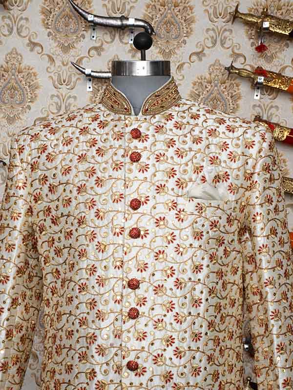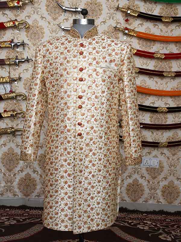 The sherwaniis generally associated with historically and is favored by than sherwaniormal occasions in especially by those from rajshthan the or sherwani is generally worn with the combination of Churidar as the lower garment.This Readymade Attire is Enhanced with Buttons and Print and is Crafted in Chinese Collar Neck and Full Sleeve