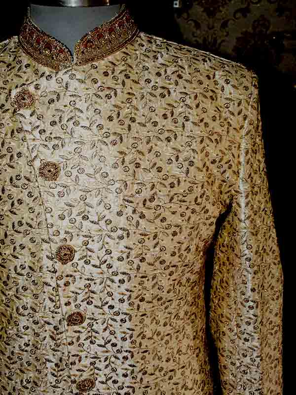 This Readymade Masculine attire with Satin Lining is Enhanced with Buttons, Resham, Zari and Sequins Work and has 1 Welt Pocket and is Crafted in Chinese Collar Neck and Full Sleeve Turban, Kanthimala and Footwear is wearing it gives royal look Showcase your elegance in this handsome men’s sherwani. It is finely tailored, and is perfect for wedding, as well as to attend other formal ethnic events, with assurance. Team it up with a stylish bead necklace andcontrasting shade Jodhpur jootis for a dashing