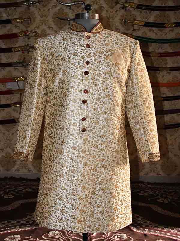 The sherwaniis generally associated with historically and is favored by than sherwaniormal occasions in especially by those from rajshthan the or sherwani is generally worn with the combination of Churidar as the lower garment.This Readymade Attire is Enhanced with Buttons and Print and is Crafted in Chinese Collar Neck and Full Sleeve